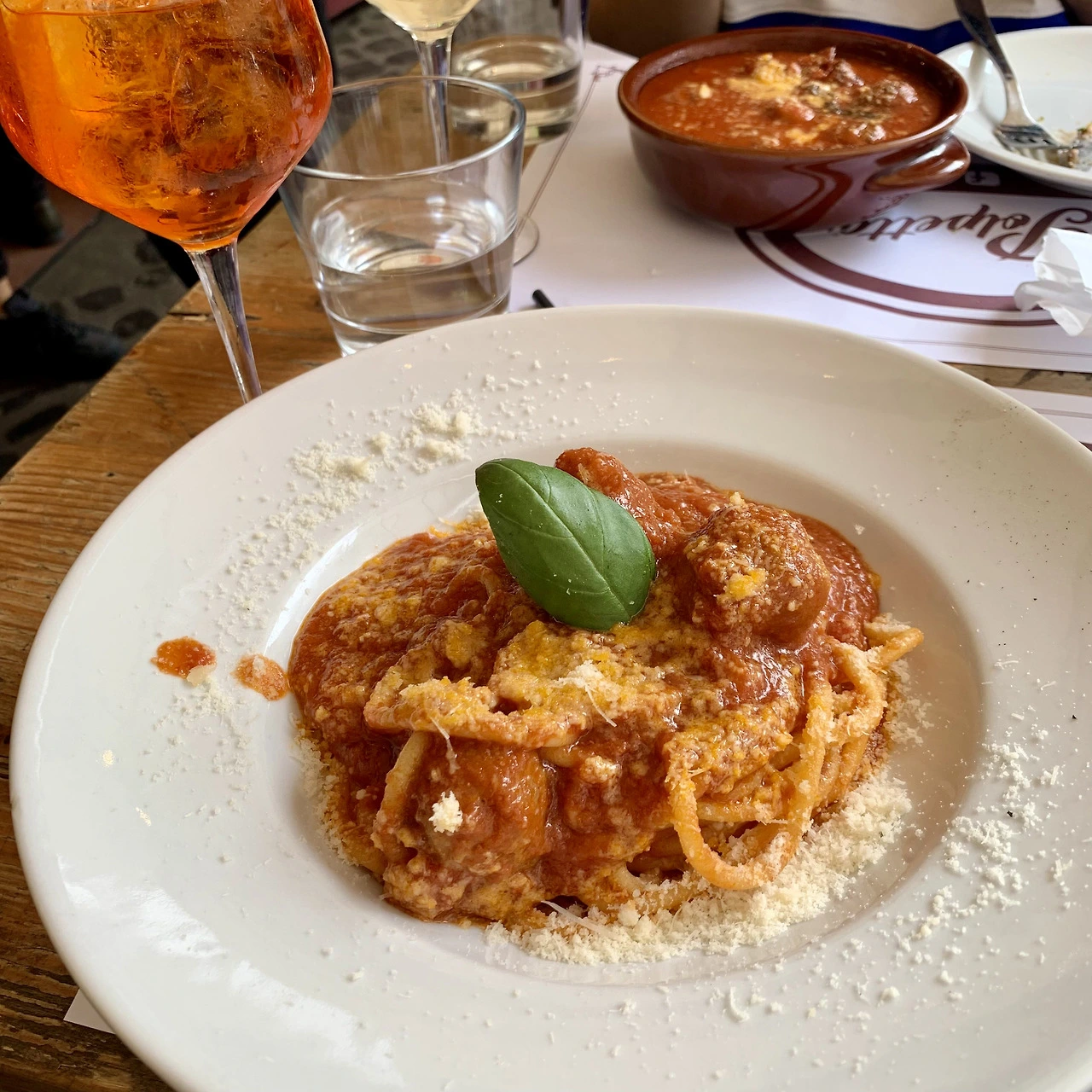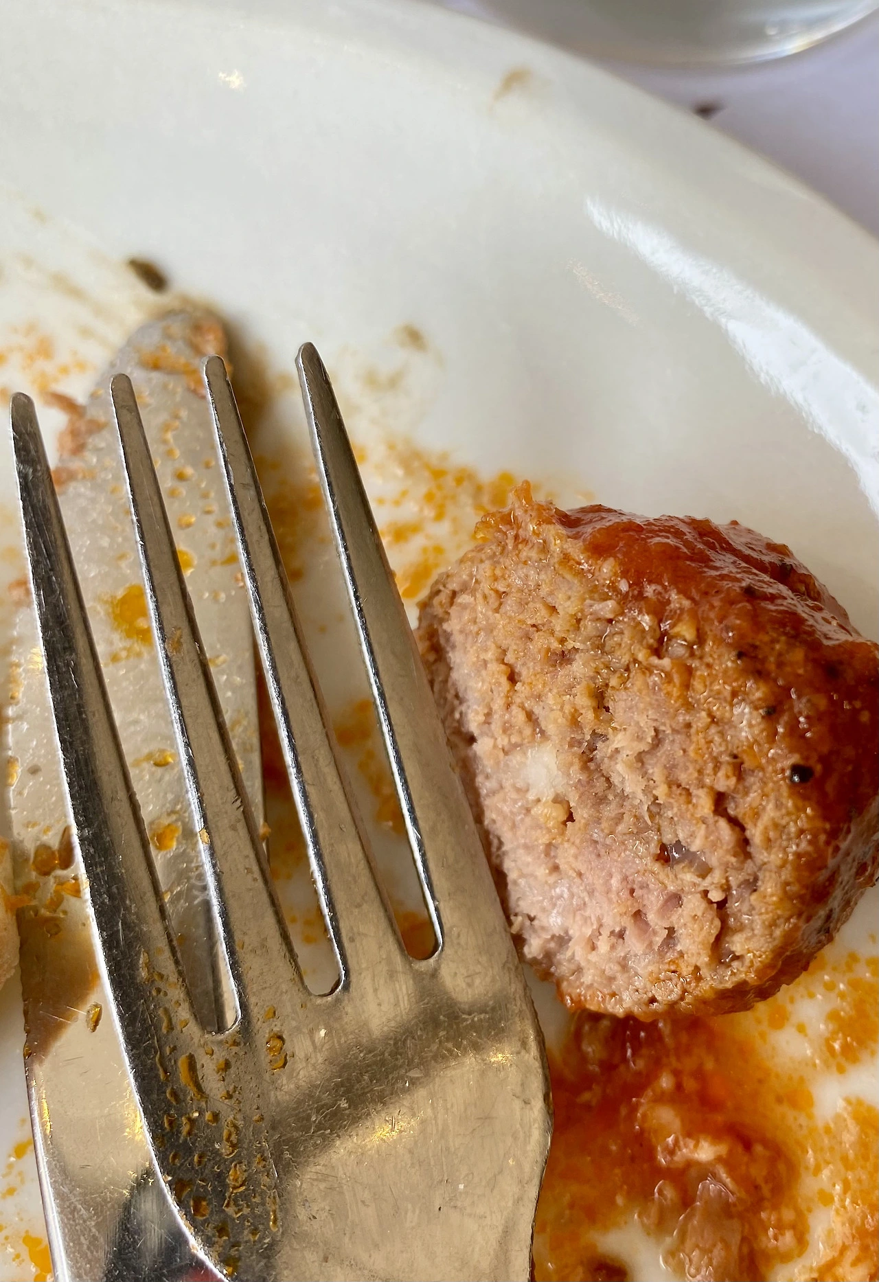 사회와 중년생은 천천히 테베레 강까지 걸어가서 가리발리 다리(Ponte Garibaldi)를 건너 트라스테베레 지구로 진입했다. 처음 가보는 곳이고 젊은이들이 많은 제법 힙(?)한 동네라는 이야기를 들어서 구석구석 뒤져보고 싶은 마음은 컸지만, 귀국하는 날인 데다가 한 달간의 여행으로 피로가 쌓인 상태였으므로 무리하지 않고 가볍게 돌아보기로 했다. 먼저, 두 사람 모두 그리 배가 고프지 않은 상태여서 벼룩시장이 열린다는 남쪽 구역까지 걸어가 보고 그 이후에 근처 카페에서 여유롭게 쉬자는 계획을 세웠다. 하지만, 결론부터 말하자면 여유는커녕 시장을 가까스로 둘러보고 식당으로 직행하기 바빴다. 시장은 예상했던 것보다 거리가 멀었고, 찾기도 쉽지 않았으며, 비포장 도로를 한참 지나가야 해서 체력소모가 컸던 것이었다. 약간의 부슬비까지 내리기 시작하는 바람에 우리는 적당해 보이는 식당으로 들어가 테라스 석에 앉았다. 앉고 보니 완자를 메인으로 하는 곳이었다. “이런 곳은 처음인데 잘됐다!” 중년생이 메뉴를 살펴보면서 말했다. 파스타든 수프든 거의 대부분의 메뉴에 미트볼이나 피쉬볼 같은 것이 함께 들어가는 구성이었다. 우리는 스프리츠와 화이트 와인으로 지친 숨을 돌리고는, 메뉴판 및 주변 테이블에서 먹고 있는 메뉴를 번갈아 참고하며 주문을 마쳤다. 날은 흐렸지만 이미 4월 말인 데다가 부슬비로 인한 습기가 더해져 제법 덥게 느껴졌다.