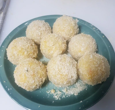 손으로 돌돌 말아 동그랗게 만든 아란치니를 계란물에 입힌 뒤 빵가루에 돌돌 굴려 제대로 묻힌다.