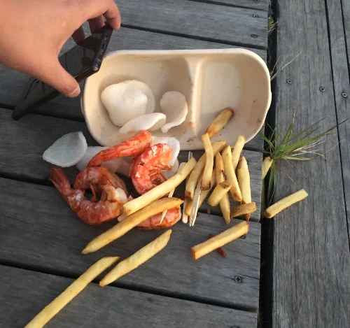 나는 병원을 나와 바람을 맞으며 배고픔을 달래기 위해서 새우와 감자튀김을 파는 것을 보고 한 세트를 구매해 자리했다. 하지만 어째, 자리에 앉자마자 쏟아버렸다.