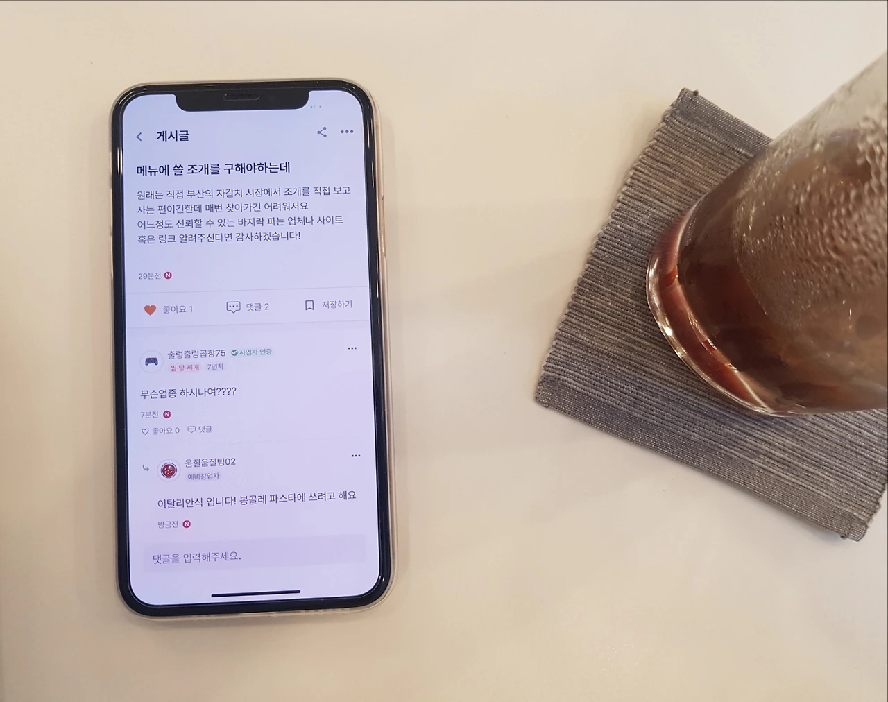조개만이 문제가 아니었다. 이용할 사이트를 구하긴 했으나 어디까지나 그 사이트들은 업체들을 소개해주는 어플이었다. 조개의 주문을 실패 할 때 느꼈던 거지만, 일반 가정에서 구매하는 눈높이와 자영업을 하는 사람의 눈높이는 각자 다른 만큼 업체에 대한 이용 리뷰 평가를 보고서 유통업체를 선택한다는 것은 다소 무리가 있었다. 소고기도 주문해야 할 곳을 알아봐야 했고, 채소 또한 가격과 신선도를 잘 따지며 최대한 합리적으로 발주할 수 있는 업체들을 찾아야 했다. 사장님 말대로 나에게 필요한 건 정보통이었다. 직접 접촉하지 않더라도 정보를 공유 할 수 있는 커뮤니티. 거기에 정말 내가 필요한 것은 자영업자에게 도움이 될 만한 정보를 얻을 수 있는 커뮤니티다. 믿을 만한 사람에게서 나오는 정보와 뭐하는 사람인지도 모르는 사람에게서 얻는 정보의 신뢰도는 꽤나 크다. 익명성이 제공되는 인터넷에서는 일반 소비자인지 자영업인지 모르는 사람에게 조언을 받는다면, 그것 또한 그저 일반 소비자의 리뷰글을 보는 것과 크게 다르지 않았다.