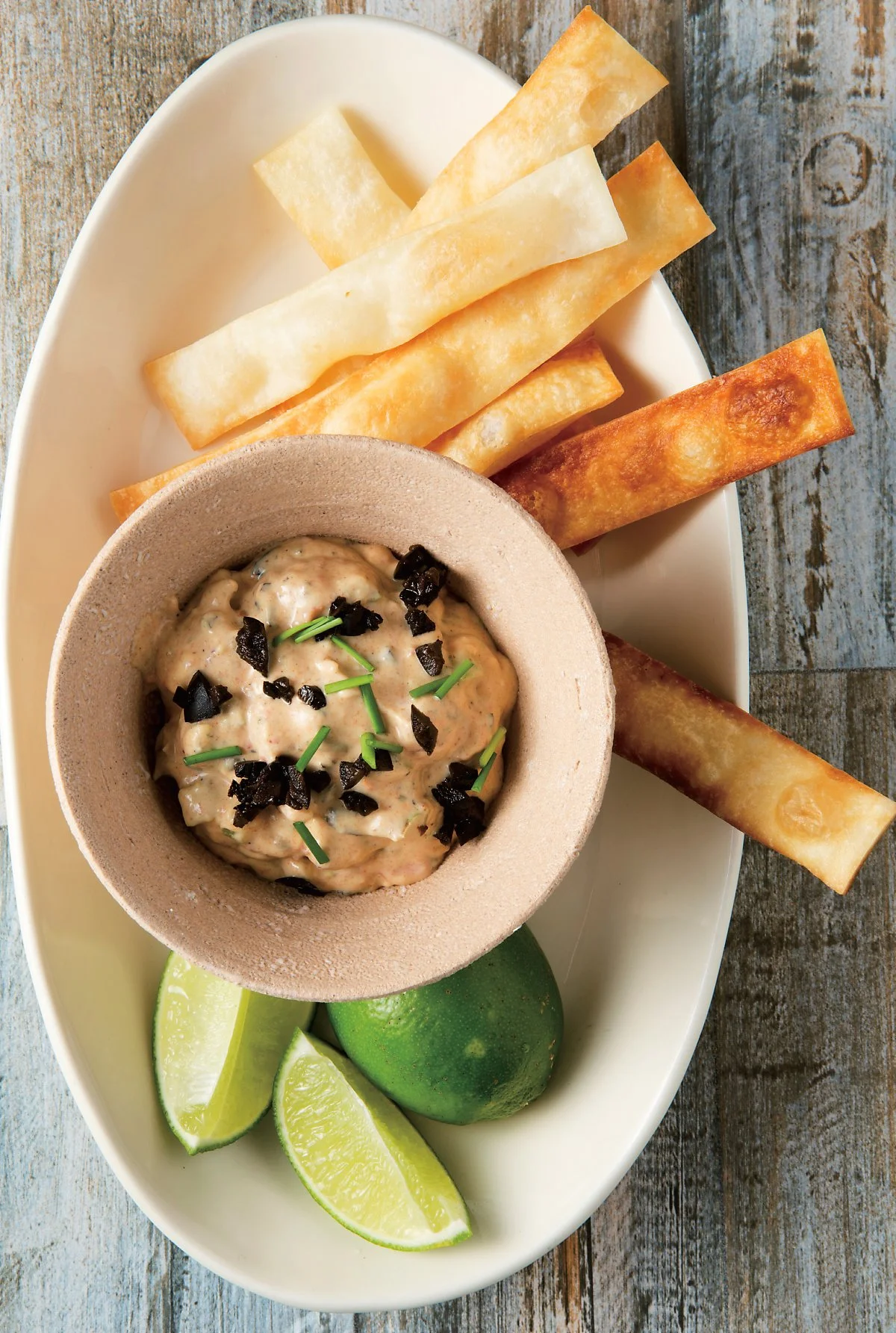 7. 그릇에 6의 치즈 소스를 먼저 담고 튀겨둔 나초칩을 넉넉하게 담고 라임 슬라이스를 곁들여 낸다.