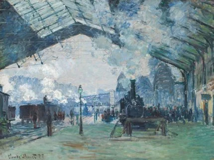 당시 사람들 에게 기차와 기차역은 관심거리가 아닐 수 없었다. 위의 그림에서 보듯 마네는 기차역에는 별로 관심이 없었다. 역 을 배경으로 인물화를 그린 데서 역보다는 인물에 더 관심이 있었음을 알 수 있다. 이와 반대로 모네는 도시의 팽창 과 문명의 산물인 기차가 방사하는 연기에 관심을 두고 이런 장면들을 연속적으로 그렸다.