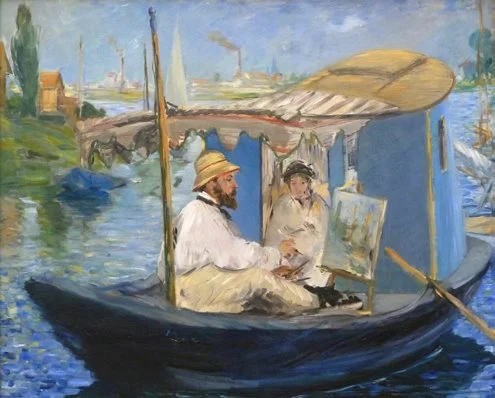 모네는 보트에 이젤을 고정시키고 센 강을 오르내리면서 강의 풍경들을 그리곤 했는데 1874년 어느 날 마네가 이런 모습을 보고 <보트 스튜디오에서 그림 그리는 클로드 모네>135를 그렸다.