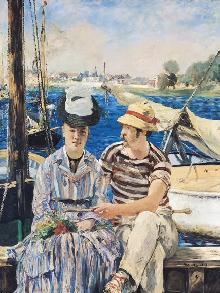 절반은 야외에서 그린 이 그림은 모네가 센강변의 풍경화에 몰두하는 데 자극을 받아 마네도 빛의 효과를 나타내는 강변의 풍경들을 그린 것이다. 마네는 이듬해 이 작품을 국전에 출품했는데 사람들은 강물을 너무 푸르게 그렸고 원근법을 무시했다고 비난했다. 어떤 사람은 “인디고색의 강물이 벽처럼 평편하고 … 아르장퇴유가 펄프와도 같다”고 했다. 하지만 마네를 옹호한 평론가들은 수면의 강렬한 푸름은 잘못된 색이 아니라 여름의 빛으로 조화시킨 것이며 또 아르장퇴유의 근대 생활상을 묘사하기 위해 정직하게 시도된 것이라고 했다. 그림에는 뱃사람이 여인에게 다가앉아 수작을 거는 것 같으며 여인은 사내에게 관심을 주지 않은 채 건성으로 사내의 말을 듣고 있다. 마네의 그림에서 여인들은 상대방을 의식하지 않고 무심한 표정으로 포즈를 취하는 경우가 흔하다. 이런 장면은 물론 마네의 연출에 의한 것이었다. 마네는 두 모델을 바짝 관람자 앞으로 당기고 배경에는 원근감을 느낄 수 있는 요소들을 넉넉하게 구성했지만 강물을 지나치게 파란색으로 칠해서 원근감이 많이 감소되고 말았다. <아르장퇴유>는 인상주의 화가들의 자연주의 화풍을 확인해주었으며 이 점이 새로운 화법임을 시위했다.