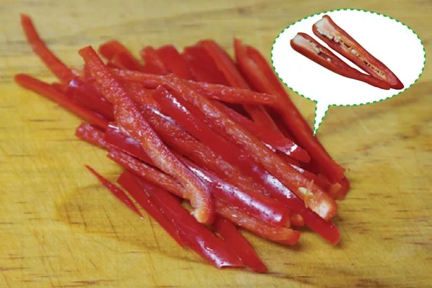 2. 채소들을 손질해 주세요. 고추는 반을 가른 뒤 씨를 제거하고 채썰어주세요.