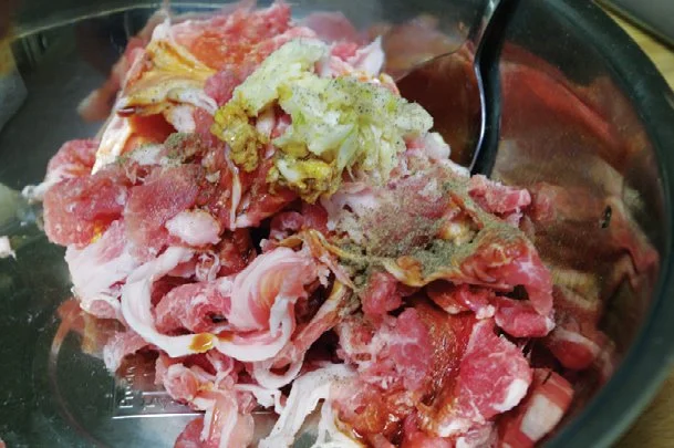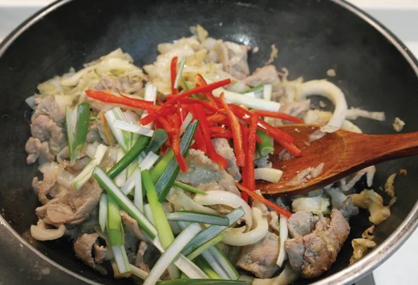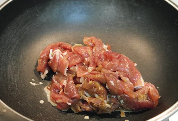 5. 깊이가 있는 프라이팬(웍)에 양념해 놓은 돼지고기를 넣고 달달 볶아주세요. 고기가 다 익으면 양배추를 넣고 굴소스 1큰술, 설탕 1/2큰술, 간장 1작은술, 소금 1/2작은술을 넣어 볶아주세요.