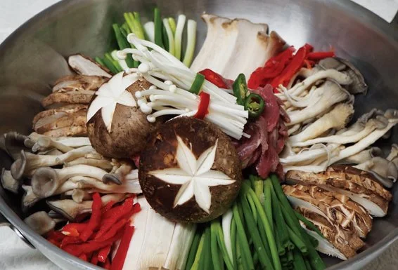 : 소고기 불고기감 300g, 표고버섯 4개, 새송이버섯 1개, 느타리버섯 1팩, 팽이버섯 1팩, 쪽파 1개, 청양고추 1개, 홍고추 2개