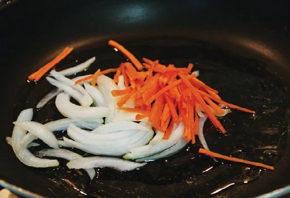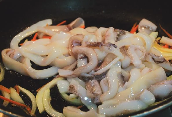 3. 프라이팬에 식용유 3큰술을 두르고 양파와 당근을 넣어 볶다가, 양파가 반쯤 익으면 오징어도 넣어 같이 볶아주세요.