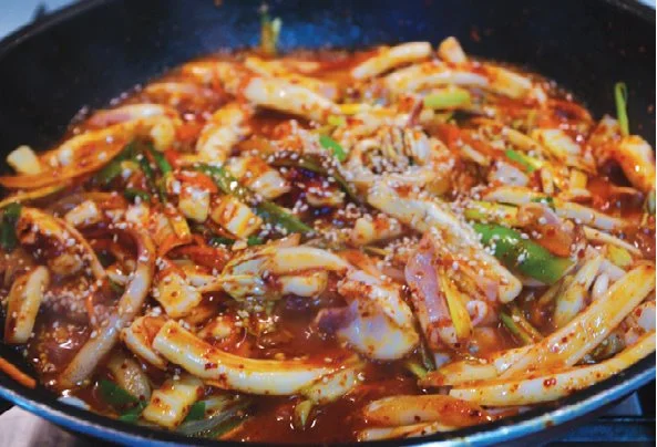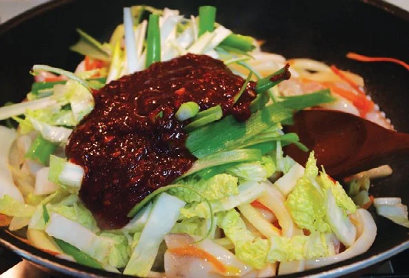 4. 오징어가 다 익으면 대파, 배춧잎, 양념장(2번)을 넣은 뒤 골고루 잘 섞으면서 익혀주세요. 마지막에 통깨와 참기름을 넣어 다시 한 번 볶으면 완성입니다.
