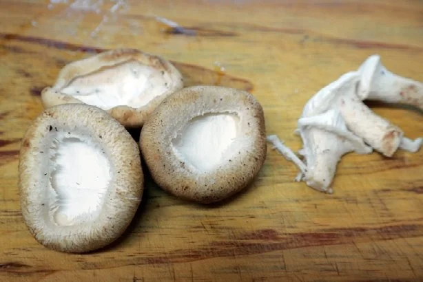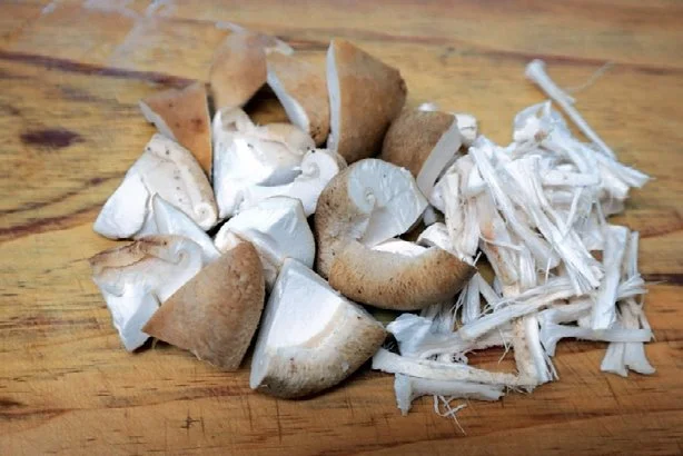 1. 표고버섯은 밑동을 떼어낸 뒤 갓은 4등분하고, 밑동은 결대로 찢어주세요. 홍고추는 반으로 갈라주세요.