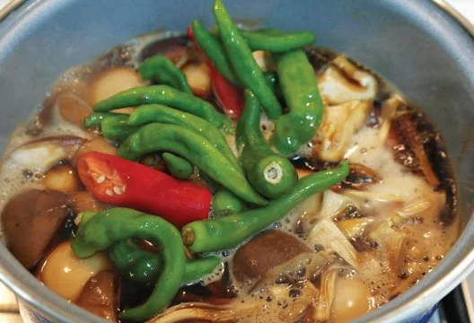 :계란 12개, 표고버섯 3개, 꽈리고추 1줌, 홍고추 1개, 물 2컵, 간장 2/3컵, 설탕 1큰술, 굵은소금 1작은술, 식초 1/2작은술
