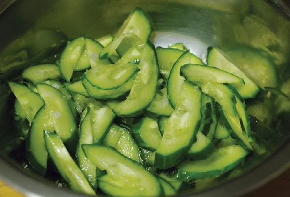 3. 오이는 어슷하게 편썰어 반으로 가른 뒤, 굵은소금을 1큰술 넣고 10분 정도 절이세요. 그랬다가 물에 헹군 뒤 양손으로 꽉 눌러 물기를 제거해 주세요.