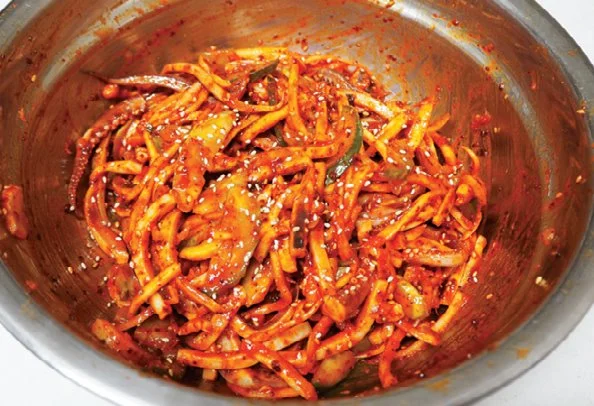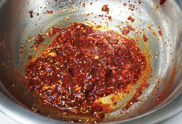 : 고춧가루 3큰술, 고추장 2큰술, 식초 3큰술, 설탕 2큰술, 맛술 1큰술, 매실액 1큰술, 소금 1/2작은술, 간장 1큰술, 다진 마늘 1작은술, 참기름 1큰술, 통깨 약간
