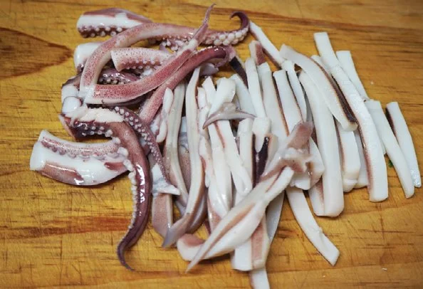 2. 오징어는 끓는 물에 데친 뒤 먹기 좋은 크기로 썰어주세요.