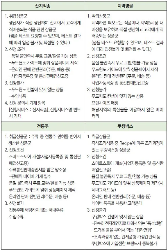 푸드윈도 입점방법 - 산지직송, 지역명물, 전통주, 쿠킹박스 총 4개의 코너가 있다.