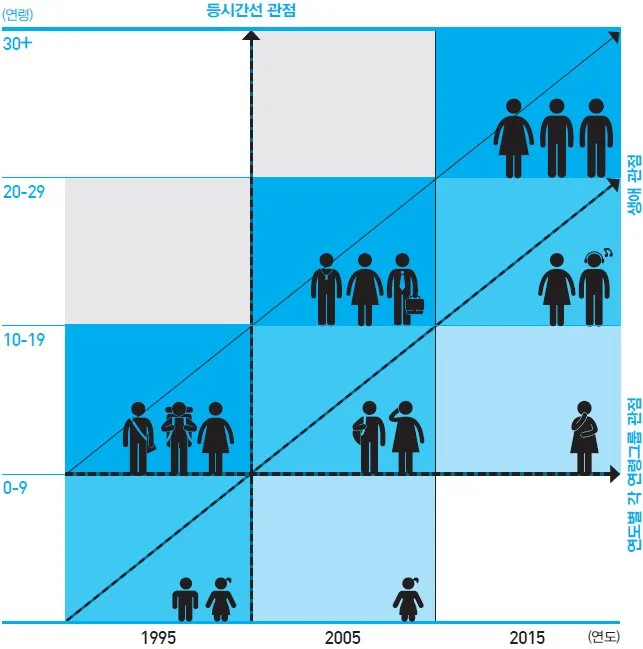 흔히 사회를 관찰할 때 가로축(period)으로 끊어서 각 시기의 특성을 보거나, 세로축(age)으로 끊어서 세대별 특성을 보곤 한다. 트렌드 분석은 전자에 가까울 테고, 세대갈등을 분석할 때에는 후자를 적용할 것이다. 그러나 인구학적 사고를 위해서는 연령과 시기를 동시에 고려해야 한다. 즉 특정 연도의 특정 연령대가 시간이 지남에 따라 어떻게 변화하는지 볼 수 있는 생애 관점(life time)이 필요하다는 것. 인구의 동태적 측면을 파악해야 소비시장이 어떻게 달라지는지를 정확히 알 수 있다.