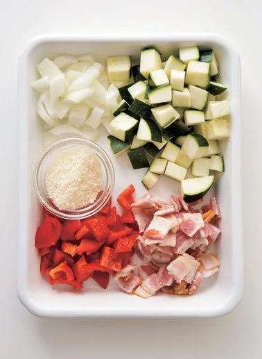 : 베이컨은 사방 1㎝ 크기로 자르고, 홍피망은 꼭지와 씨를 제거한 뒤 사방 1㎝로 썰어요. 애호박과 양파도 사방 1㎝ 크기로 썰어요.