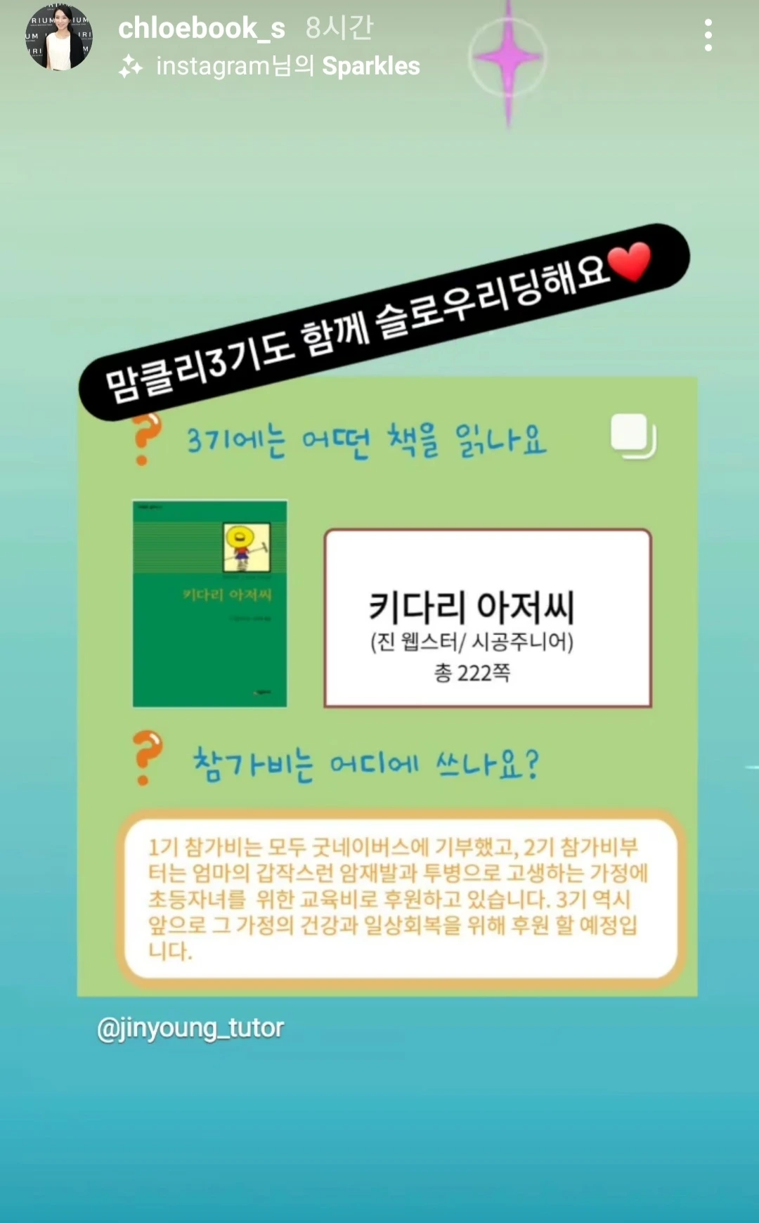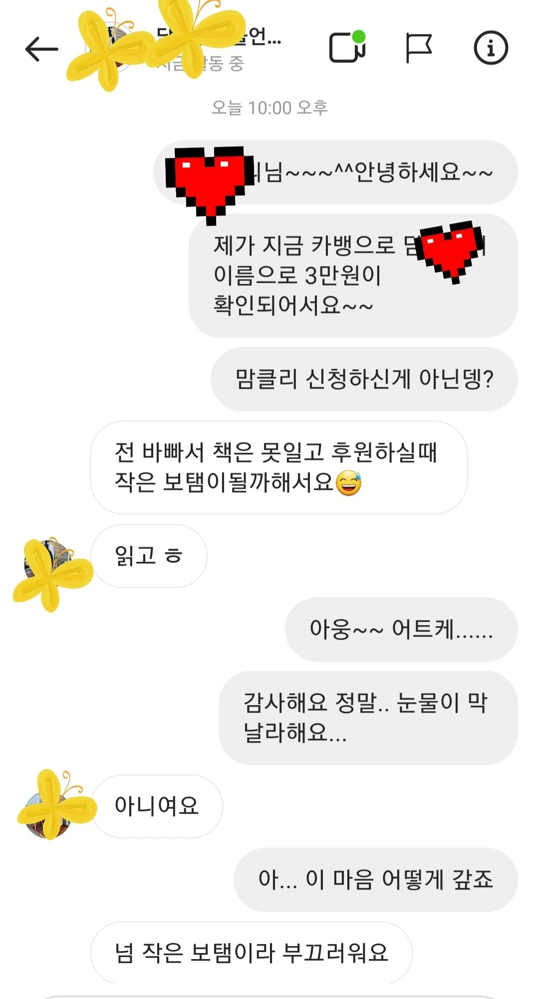 온라인 독서모임을 시작하면서 참가비를 기부와 후원에 쓰기로 마음을 먹었는데, 나의 이 작은 마음에 동행해주는 사람들이 나타났다. 매 기수마다 함께 하겠노라고 말해주는 사람, 너무 조용한 성격이라 말도 없고 표현도 없어 마음을 잘 모르겠는데 모집할 때는 1등으로 신청을 해주는 사람, 바빠서 책은 못 읽을 거 같은데 후원하고 싶다고 선뜻 입금부터 해주는 사람. 심지어 '맘클리후원'이라는 이름으로 누군지도 모르게 2만 원을 보내주는 사람(이 글을 보신다면 저에게만 살짝 귀띔을), 아픈 가정에 보태고 싶다고 더 넣어주는 사람까지,
