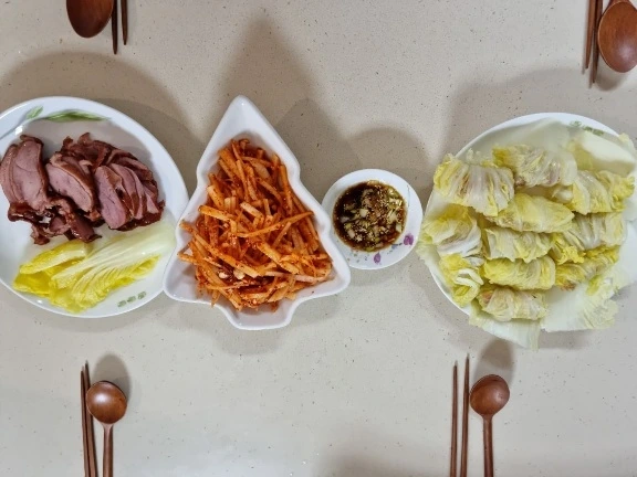 알배추를 먼저 꺼내서 얼른 물에 씻고 찜솥에 살짝 쪄준다. 그리고 냉동실에서 닮가슴살(양념되어 익은)을 꺼내서 살짝 대친 배추에 말아준다. 알배추가 살짝 쪄지는 동안, 닮가슴살이 해동되는 동안, 빠른 손놀림으로 무생채를 뚝딱 무쳐 낸다. 닮가슴살과 배추를 돌돌 말아서 담아주고 얼른 양념소스도 준비한다.~ 아이들은 배추를 안좋아하니 훈제오리 살짝 스팀해서 머스타드 준비해서 먹게 해준다~. 이렇게 하는데 1시간도 채 안걸린다.