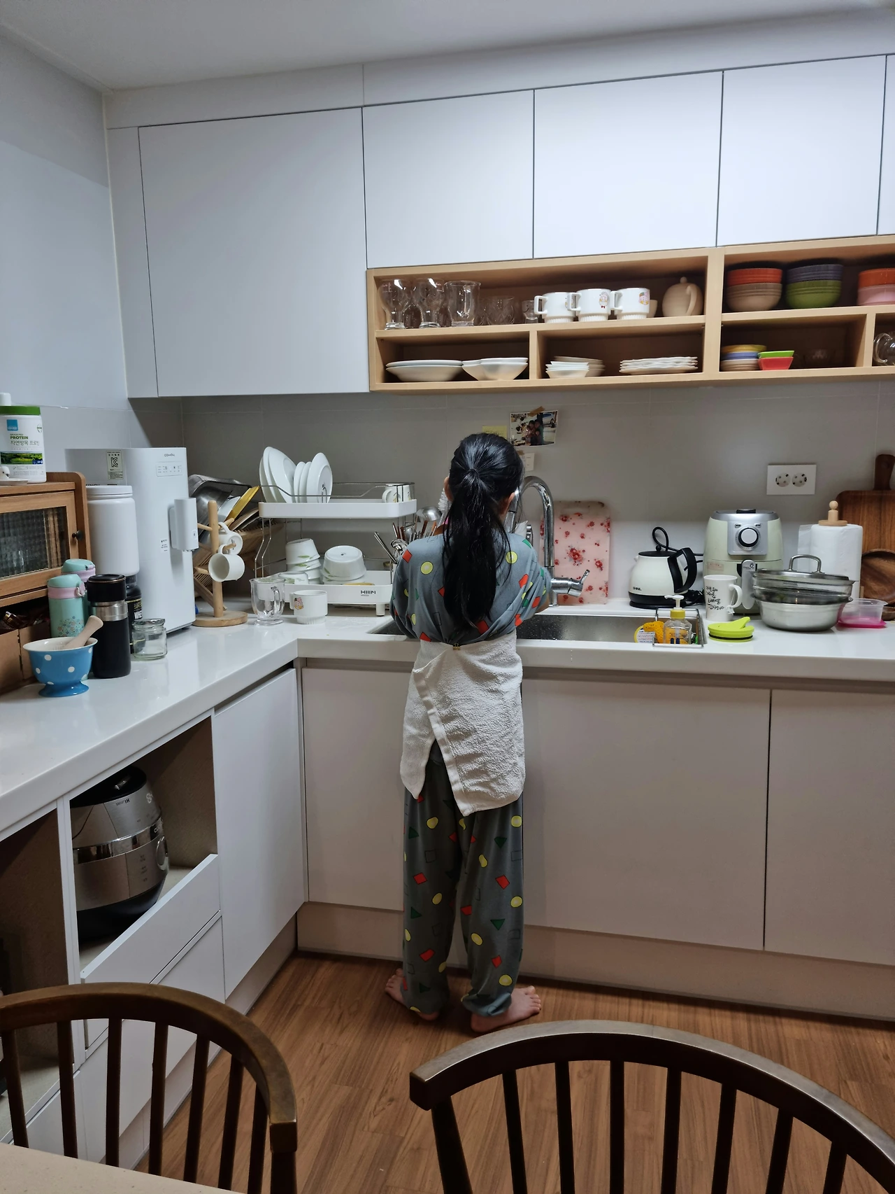수건을 앞치마처럼 두르고 설거지 중인 둘째 딸