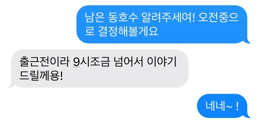 「 지금 남아있는 동호수 좀 알려주세요. 오전 중으로 결정하겠습니다. 」
