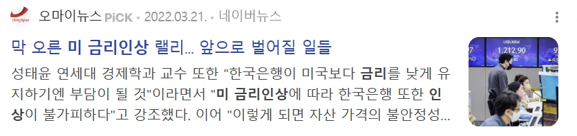 「 ··· 문제는 미국이 금리 인상의 강도와 속도를 높일 경우 우리나라 역시 큰 타격을 받을 수 있다는 점입니다. 선진국으로의 자금 이동을 최소화하기 위해선 한국은행도 함께 금리를 인상해야 하는데 이 경우 이미 ‘영끌’등으로 과도한 채무를 짊어지고 있는 사람들의 고통은 커질 수밖에 없게 됩니다. KBS 뉴스 김대출이었습니다. 」