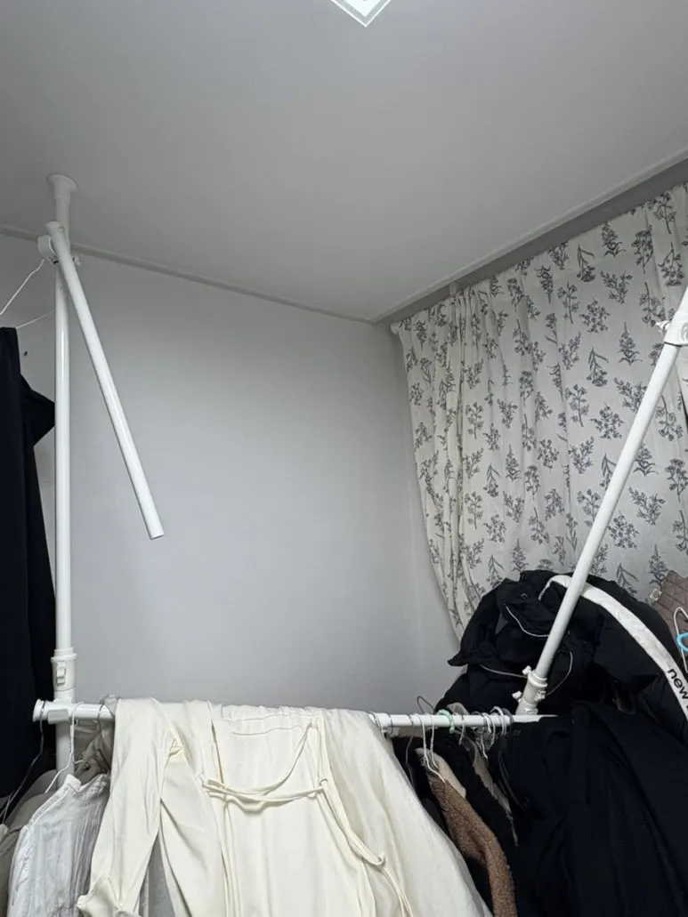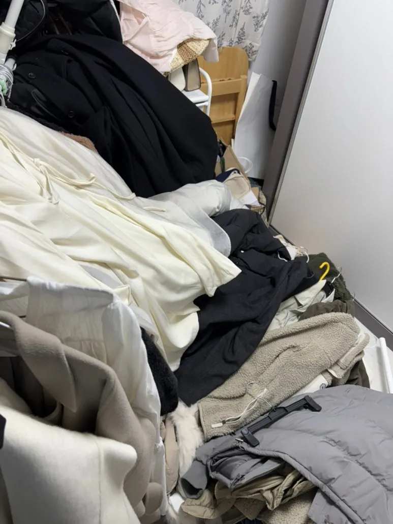 "옷 방에 있는 행거가 다 무너졌어. 큰맘 먹고 옷 정리하려 했는데 나 깔려 죽을뻔했어.."