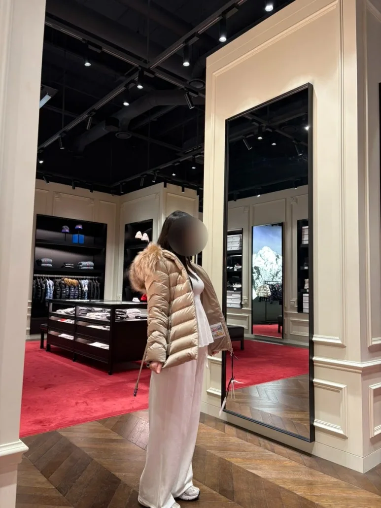 몽클레어 패딩을 입은 와이프가 그대로 매장을 나가려 한다. 남편에게 제지당하자 이제는 제자리에서 빙빙 돈다.