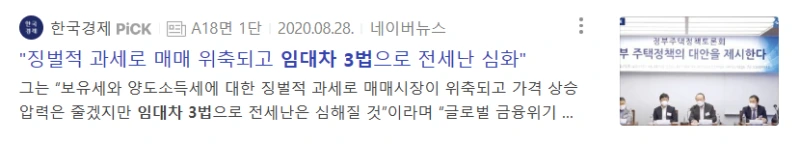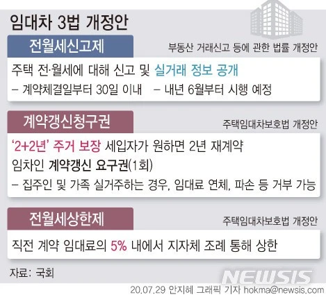 “임대차 3법이 전격 시행되었습니다. 임차인들은 계약갱신청구권을 사용해 기존 전세 계약 2년에 +2년 더 살 수 있으며 집주인은 임대료를 5% 이상 올리지 못하게 되었습니다.”