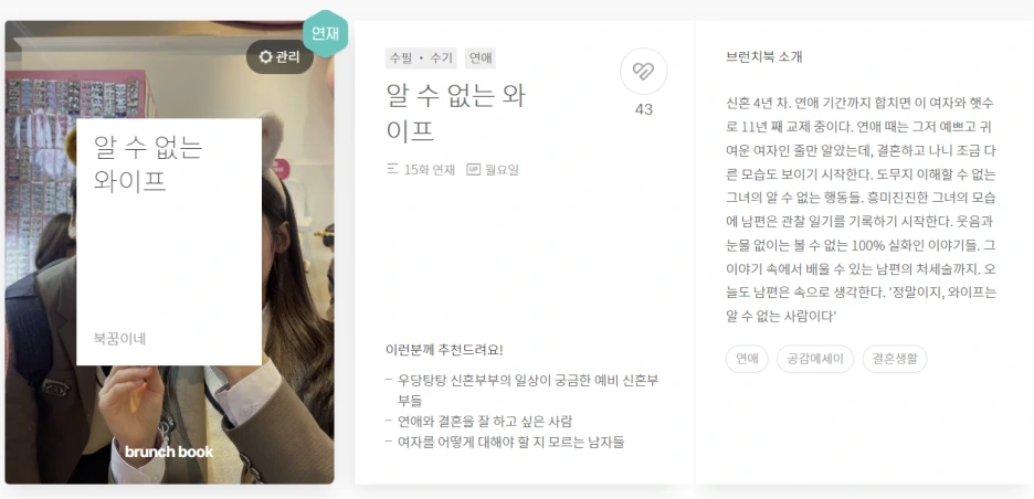 브런치 스토리의 [알 수 없는 와이프] 연재 브런치 북은 다음주가 이제 마지막이다. 그런데 뒤늦게 이렇게 사랑을 받았으니.. 몇 개의 시리즈를 더 연재해야 하나 고민이 생기기도 한다. 정말 큰 고민.