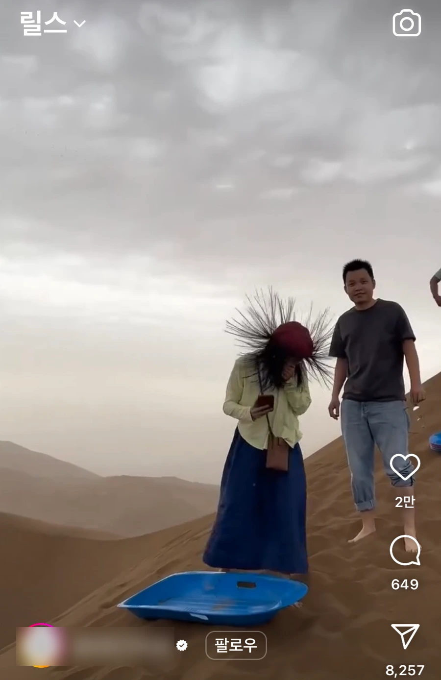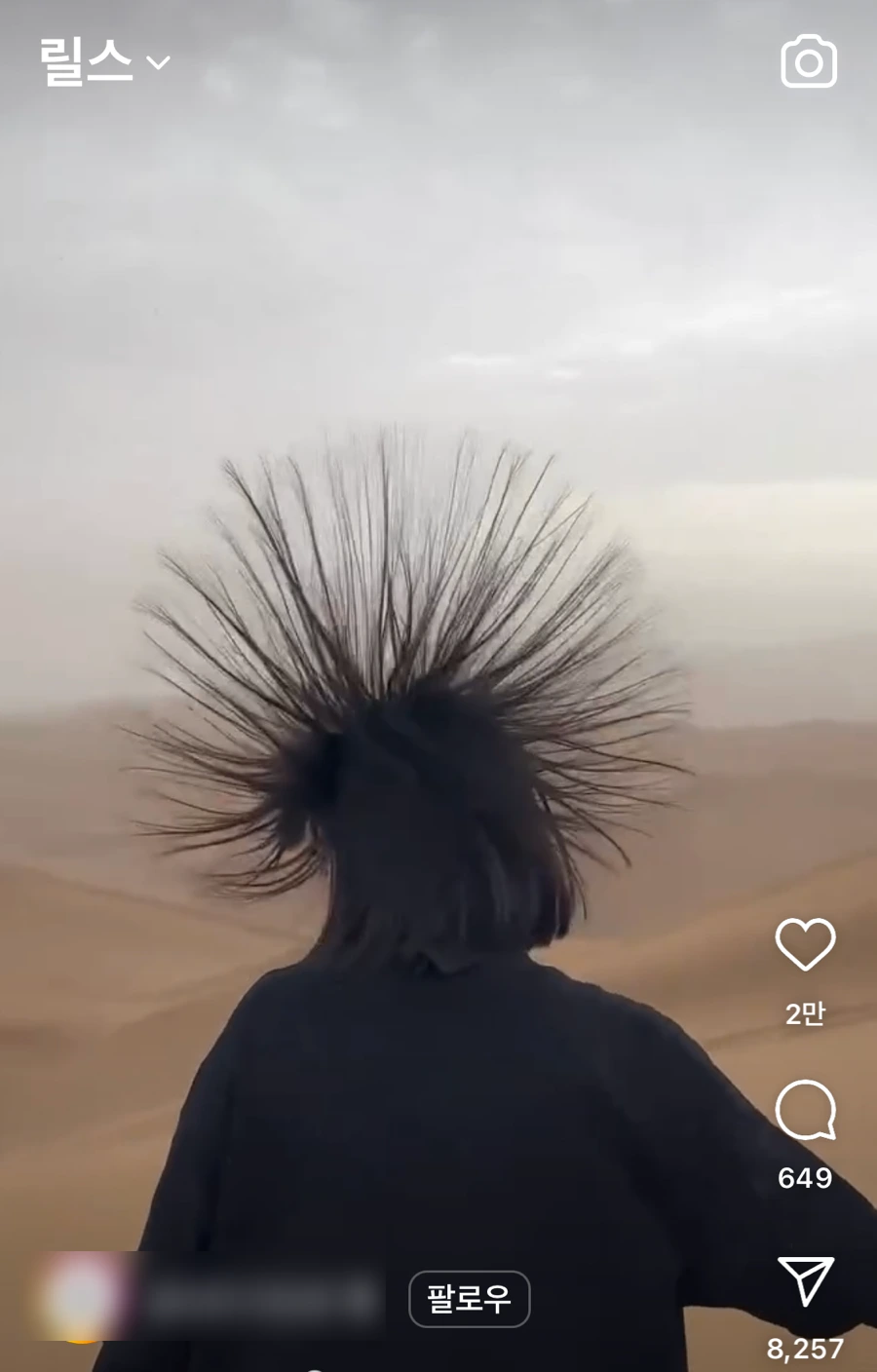 인스타로 릴스 여행을 하고 있었나 보다. 이번엔 사막으로 여행을 떠난 모양이다. 사막에서 어떤 여자들의 머리가 하늘로 뻗치는 영상을 보고 있다.