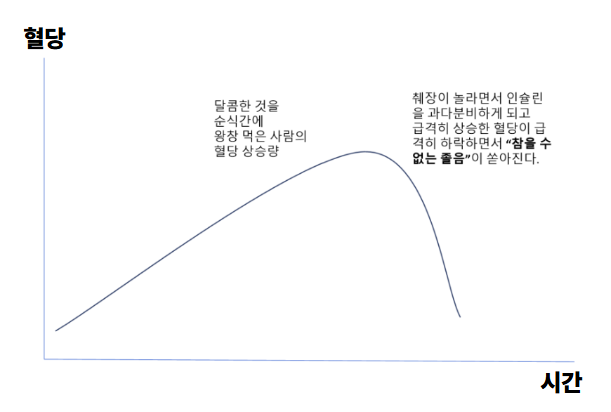 곧이어 인슐린이 과다 분비되어 혈당을 급강하시키죠.