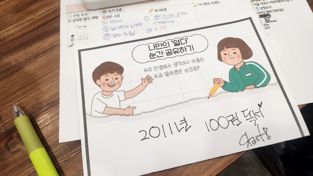 전국의 각 동네책방은 각자만의 개성이 있으니 추천한다는 리더의 말에 호기심을 갖게 되었고, 독후활동으로 <나만의 '열다' 순간 공유하기>를 진행했다. 과연 우리 회원님들의 인생의 변화가 생긴 순간은 언제였을까? 너무 궁금했고, 나도 여러 순간 중 그래도 내 인생의 가장 큰 전환은 1년 100권 독서라는 것은 부정할 수 없어 이 내용으로 공유했다.