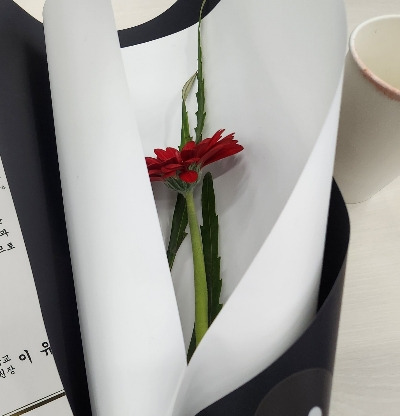 그러다 갑자기 책 표지를 싸야겠다는 생각이 들었다. 그러나 예전 아기 때 자주 싸던 달력은 없고, 신문지도 없다. 뭘로 싸면 좋을까 생각하다가 최근에 꽃다발 받았던 게 생각나서 그 종이를 이용해 보자며 책에 대어 보았다.