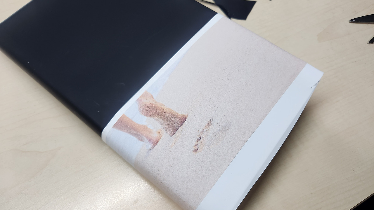 라벨지로 출력해 흰 종이에 붙이고 띠지처럼 일부만 쌌다.