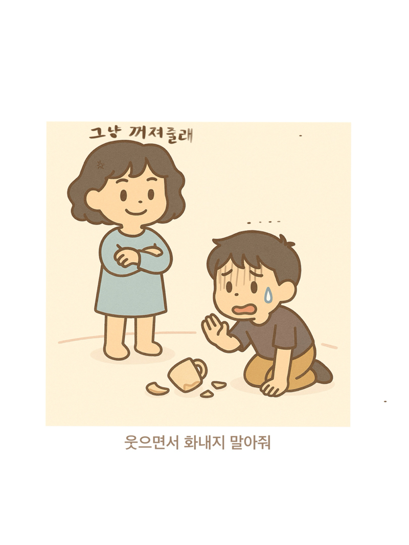 우리 집의 모든 집안일과 청소는 늘 내가 해왔다. 모든 궂은일을 나만 한다고 느껴져 화장실 청소를 남편에게 넘겼다. 그런데 남편은 못하는 건지 귀찮은 건지 청소를 대충 해놓은 덕분에 물 때와 곰팡이, 찌든 때까지 결국 내가 다시 맡아 청소를 해야 했다. ‘못하는 걸 어떡하겠어.‘ 하며 참고 넘어갔다. 어느 날 설거지를 해주겠다고 나선 남편. 다음 날 아침, 그릇을 꺼내려다 겉면까지 기름이 번들거리는 걸 보고 또 한숨이 나왔다. 결국 또 내가 다시 다 닦을 수밖에 없었다. 제발 신경 써서 해달라고 부탁하고, 한 번 더 넘어갔다.