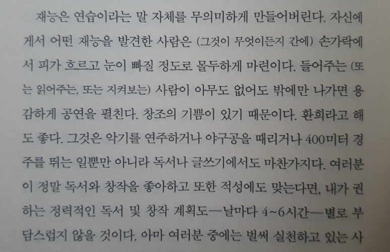 세계적인 베스트셀러 작가의 비결은 생일날에도 빠짐없이 하루 2천 자, 10페이지 분량의 글을 쓰는 것. <유혹하는 글쓰기>, 스티븐 킹의 창작론을 통해 작가는 타고 나는 것이기보다는 스스로를 빚어가는 것임을 깨닫게 되었습니다. 하루 1페이지도 쓰지 않으면서 재능이 없다는 핑계는 대지 말아야겠다는 다짐도 하게 되었죠. 작가가 되는 길, 결국 왕도는 없고 엉덩이 붙이고 앉아서 쓰는 것뿐입니다.