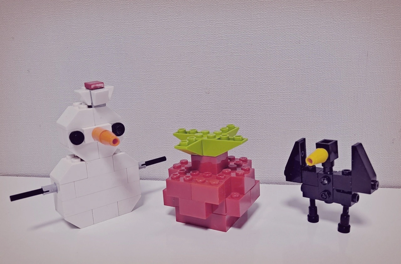 (작은애가 만든 레고 미니 창작물: 눈사람, 토마토, 까마귀)