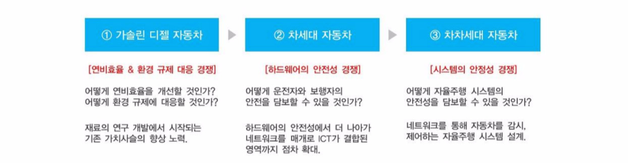 도요타의 프리우스는 연비효율과 환경 규제 대응 측면에서 최고의 경쟁력을 가졌다 할 수 있다. 하지만 경쟁의 영역은 이미 ICT를 통한 안전성 경쟁을 넘어 자율주행 시스템의 영역으로 넘어가고 있다. ①번과 ②번 영역에서 경쟁 우위를 확보했던 기존의 자동차 제조사들이 ③번 영역에서도 경쟁 우위를 확보할 수 있을지는 미지수이다.