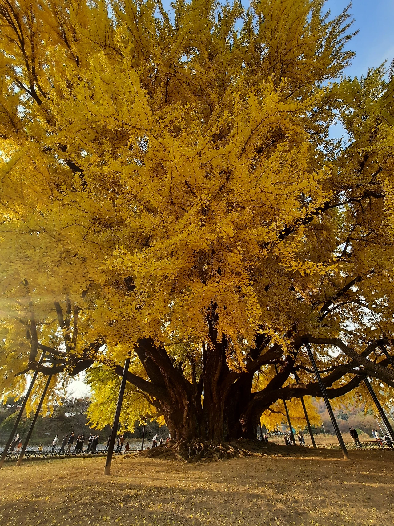 그 길을 따라 조금 더 걸어 들어갔다. 갑자기 시야가 확 트인 넓은 공간이 나타났다. 저 멀리서 헤아릴 수 없는 노란 잎들이 눈앞에 보이기 시작했다. 조금씩 가까이 다가가면서 드러나는 나무의 풍채는 장관이었다. 사진으로 보았을 때도 멋들어졌지만, 실물로 보는 그 나무는 더욱 거대하고 장대했다. 가꾸어지지 않은 주변 풍경에 비해 그 나무만이 유독 강렬하게 존재감을 내뿜고 있었다.