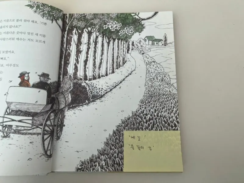 빨간 머리 앤을 읽어 줬을 때 일이다. 처음 매슈를 만나 마차타고 가는 가로수길이 멋없다며 앤은 아름다운 풍경에 걸맞는 ‘기ㅡ쁨의 하얀 길’이라 지어주는 장면을 읽었다. 눈에 보이는 아름다운 곳마다 멋진 새 이름을 붙여주는 앤의 모습이 즐거워 보였다. 우리는 잠시 읽는 것을 멈추고 그림 속 가로수길을 보며 이름을 지어 보았다. 아이들은 ‘내 길’, ‘물 꽃의 길’이라는 이름을 지어 즌다. 아이들은 단순히 듣기에만 그치지 않고 책에 적극적으로 개입할 시간을 갖는다. 빨간 머리 앤을 읽는 동안 아이들은 차 타고 이동하면서 창밖으로 보이는 길들에 이름을 남겨 주는 놀이는 계속되었다.