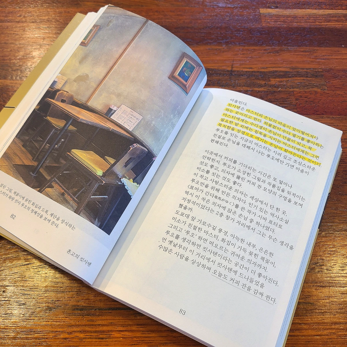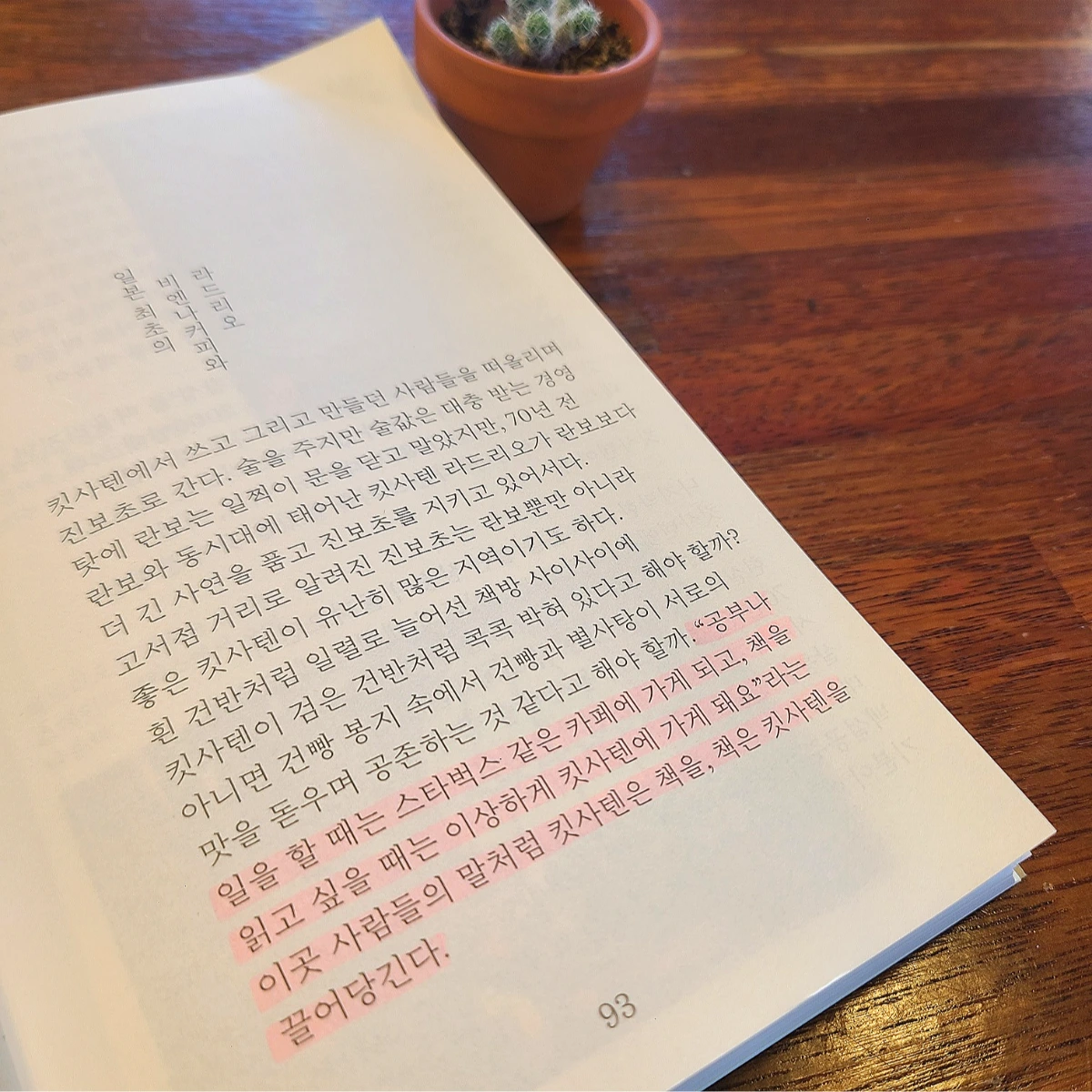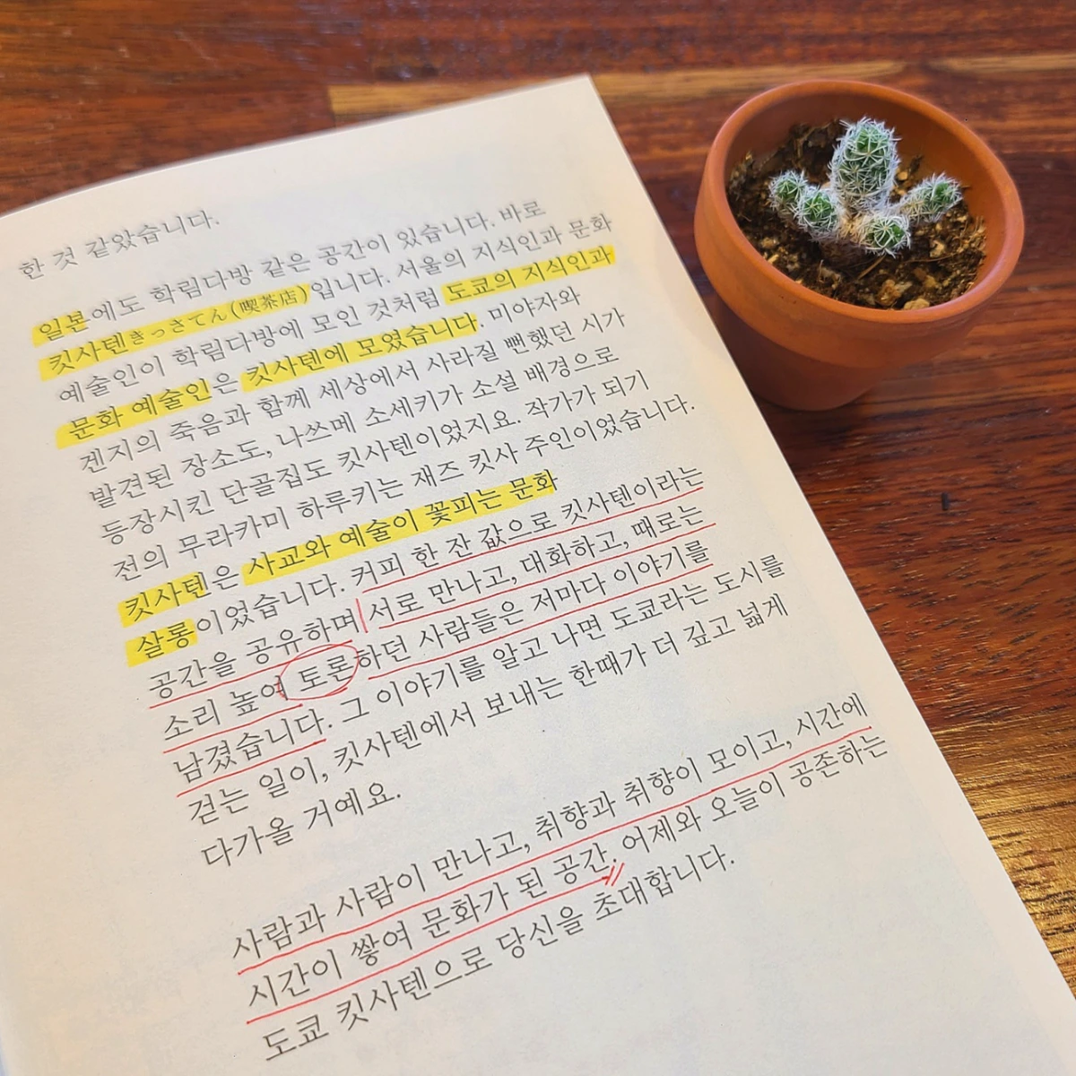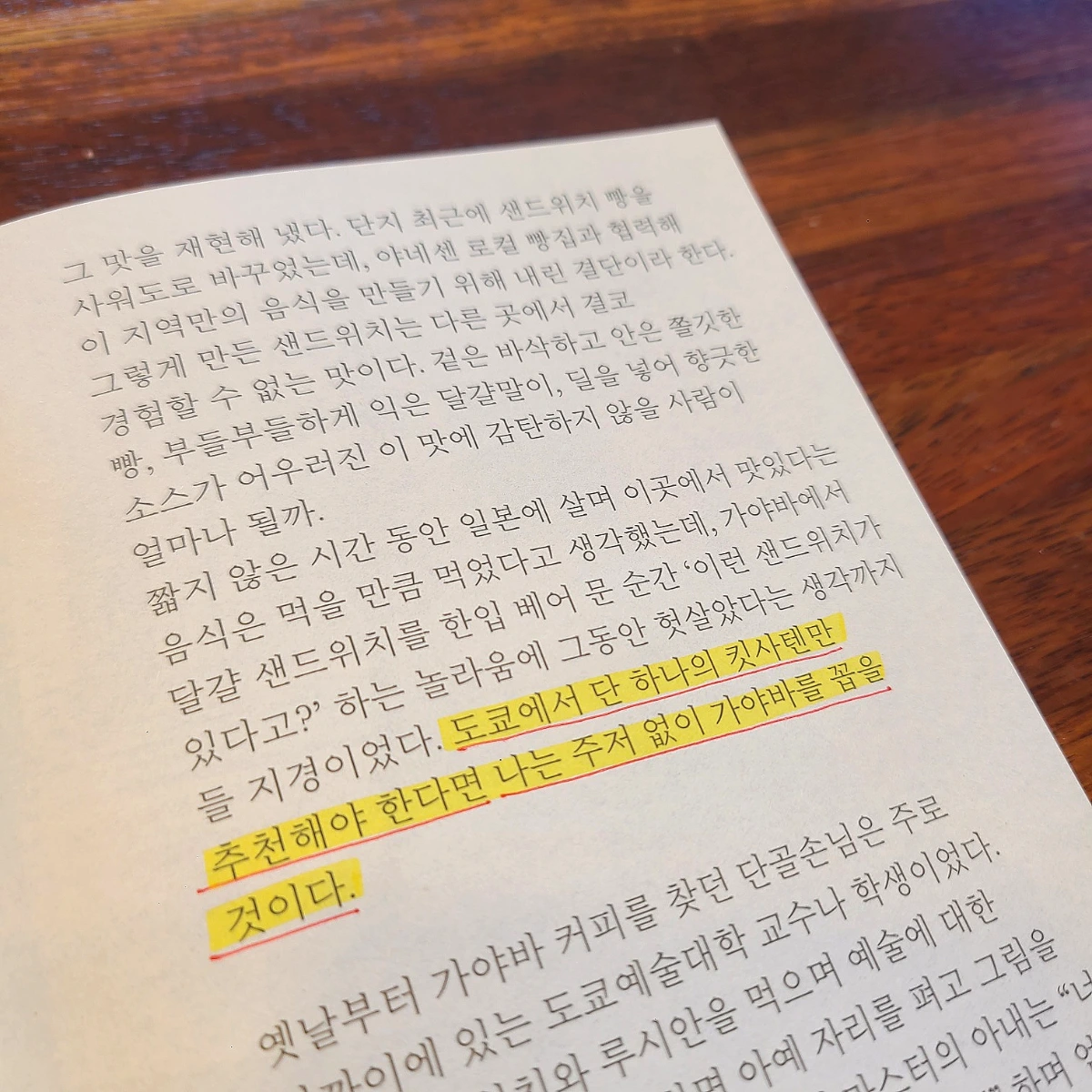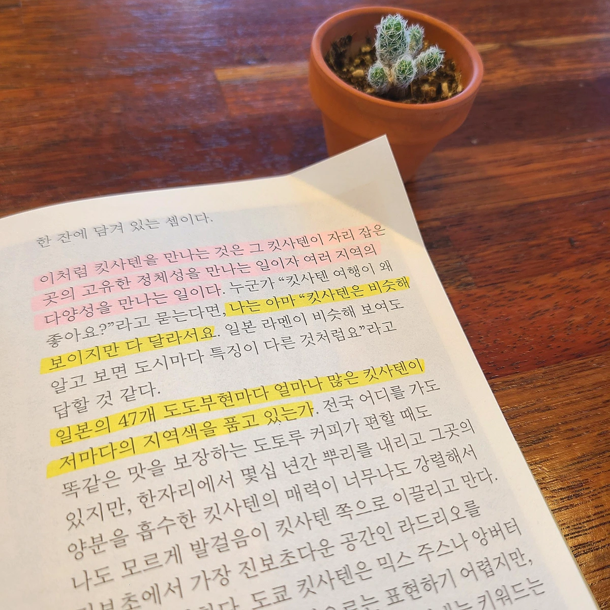 그러면서 이 책을 읽지 않고 만약 일본 여행을 갔더라면. 여행 중 잠시 쉬어갈 '킷사텐'을 그냥 지나칠 뻔했겠구나,라는 생각이 들자 책상에 놓인 책을 가슴에 끌어당기며 품어주었다.