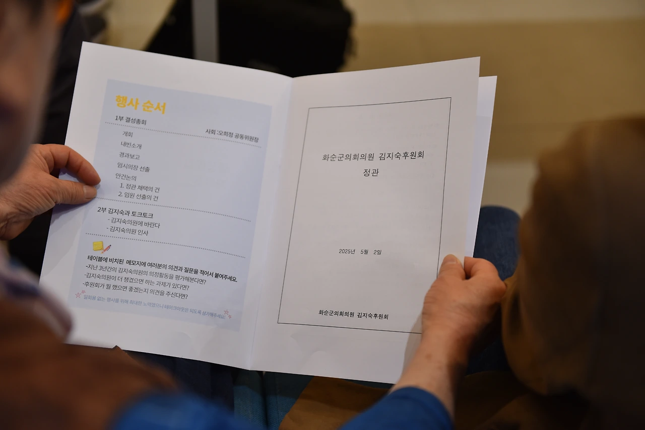 지난 2일, 김지숙 화순군 의원(43·진보당·화순읍)은 지방의원 후원회 결성총회를 오후 7시에 개최했다. 김 의원 지역구인 화순읍 아로요 카페에서 김 의원 지지자와 주민 90여 명이 참석했다. 총회는 1부 임시의장 선출 및 정관채택, 임원 선출이 안건으로 상정되었다. 2부는 참석한 이들의 의견과 질문에 김 의원이 답변하는 형식으로 진행되었다. 현장에 참여한 주민들의 지역 현안 및 실생활에 변화의 순풍을 열망하는 이들이 모인 자리로 풀이된다.