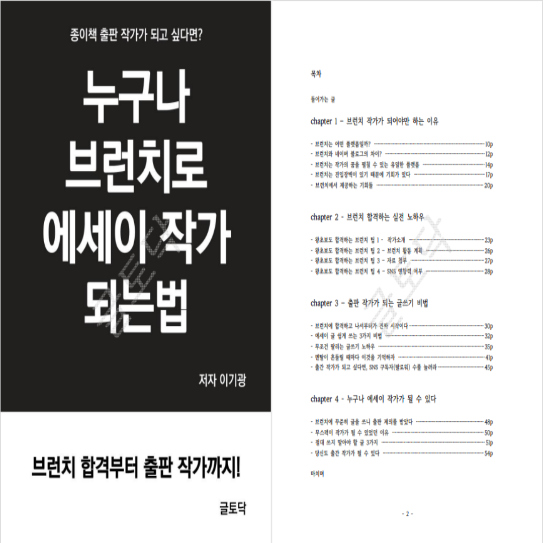 나는 많은 분들이 브런치를 더 잘 활용하고 출판 작가가 될 수 있게 돕고 싶다. 그래서 1년 동안 구르면서 배운 나만의 노하우를 담은 전자책을 만들었다. 이 전자책은 60페이지를 기획으로 목차를 작성하였고 출간 작가를 목표로 하는 사람들을 대상으로 삼았다.