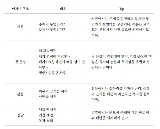 에세이는 논리구조로 잘 짜인 문단의 집합체이다. 소설처럼 순수창작물이 아니기 때문에 누구나 도전해 볼 수 있다. 또한 에세이를 잘 쓰게 된다면, 작가로 등단하는 일도 비교적 쉽다. 브런치나 네이버 블로그, 인스타그램, 유튜브 같은 SNS를 통해 출간 작가가 될 수 있는 세상이다.
