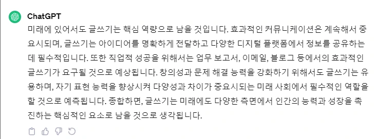 chat GPT AI에게 "글쓰기 역량이 미래에도 필요한 기술일까?라는 질문을 던져보았다." 대답은 이러하다.