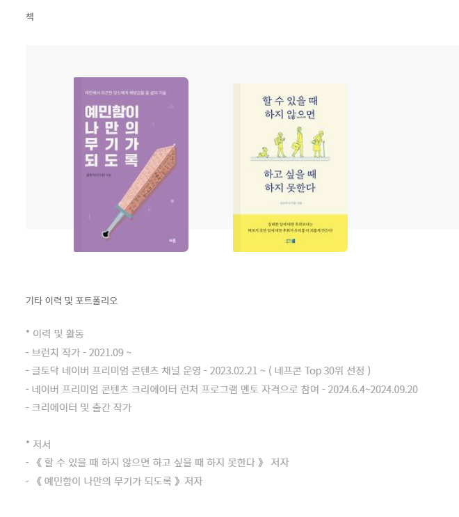 오기로 시작한 글쓰기가 어느덧 직업이 되었다. 나는 2권의 책을 출판한 프로 작가이다. 나는 네이버 프리미엄 콘텐츠라는 플랫폼에서 유료 창작자로 활동 중이다. 또한 네프콘에서 top 30위를 유지하는 영향력 있는 채널을 보유하고 있다.