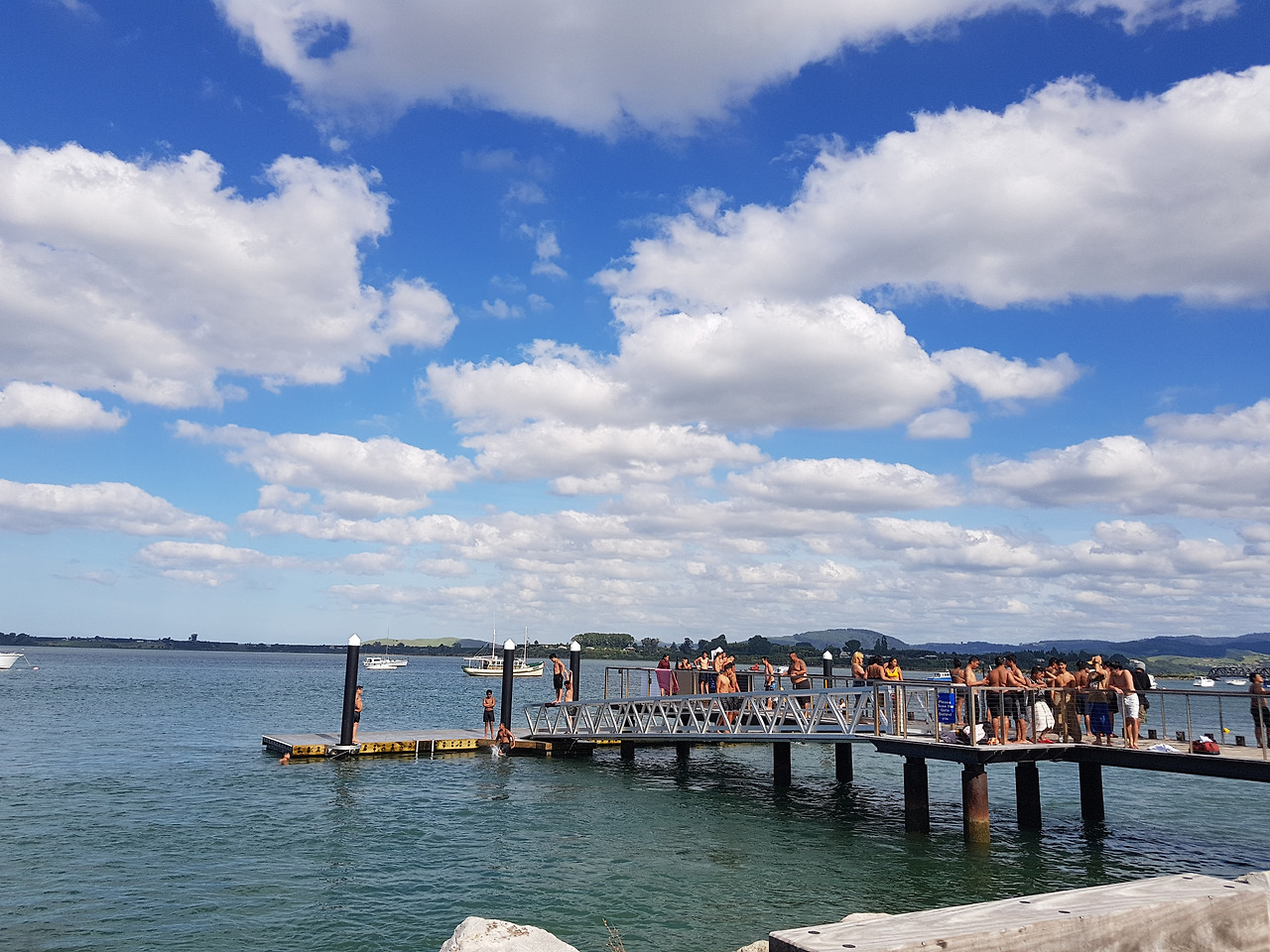 타우랑가 바닷가. 뛰어드는 아이들