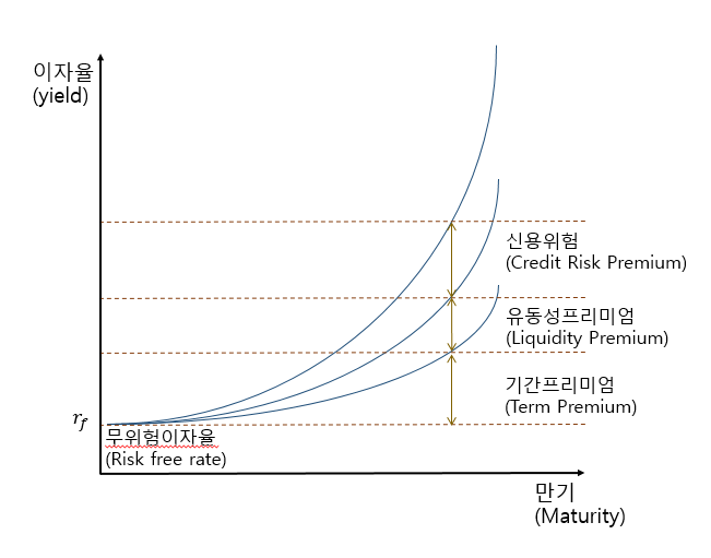 이자율 결정의 기초는 무위험 이자율(Risk free yield)에서 시작한다. 이자란 돈을 빌려준 대가인데, 여기에는 항상 위험이 따른다. 돈을 빌려간 사람이 이자를 제때 내지 않거나 원금을 돌려주지 않을 수 있기 때문이다. 국가나 중앙은행에게 빌려준 돈은 이런 위험이 없다. 나라가 망하지 않는 한 이자와 원금을 꼬박꼬박 받을 수 있을 것이다. 국가가 채무자인 국고채(국채), 한국은행이 채무자인 통화안정증권(통안채)의 이자율이 무위험 이자율이다.