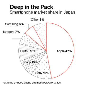 하지만 2009년 2월 Softbank가 2년 약정으로 iPhone 3G를 일본 시장에 들여오면서 상황은 완전히 역전된다. 아이폰은 젊은 여성들을 중심으로 패션의 아이콘으로 자리 잡았고, 2012년에는 Sharp, Fujitsu를 넘어 일본 시장 점유율 1위를 차지하였다("How the iPhone conquered Japan", Fortune, Jun 26 2014). 이후 일본의 스마트폰 시장은 완전히 Apple에 넘어갔다.